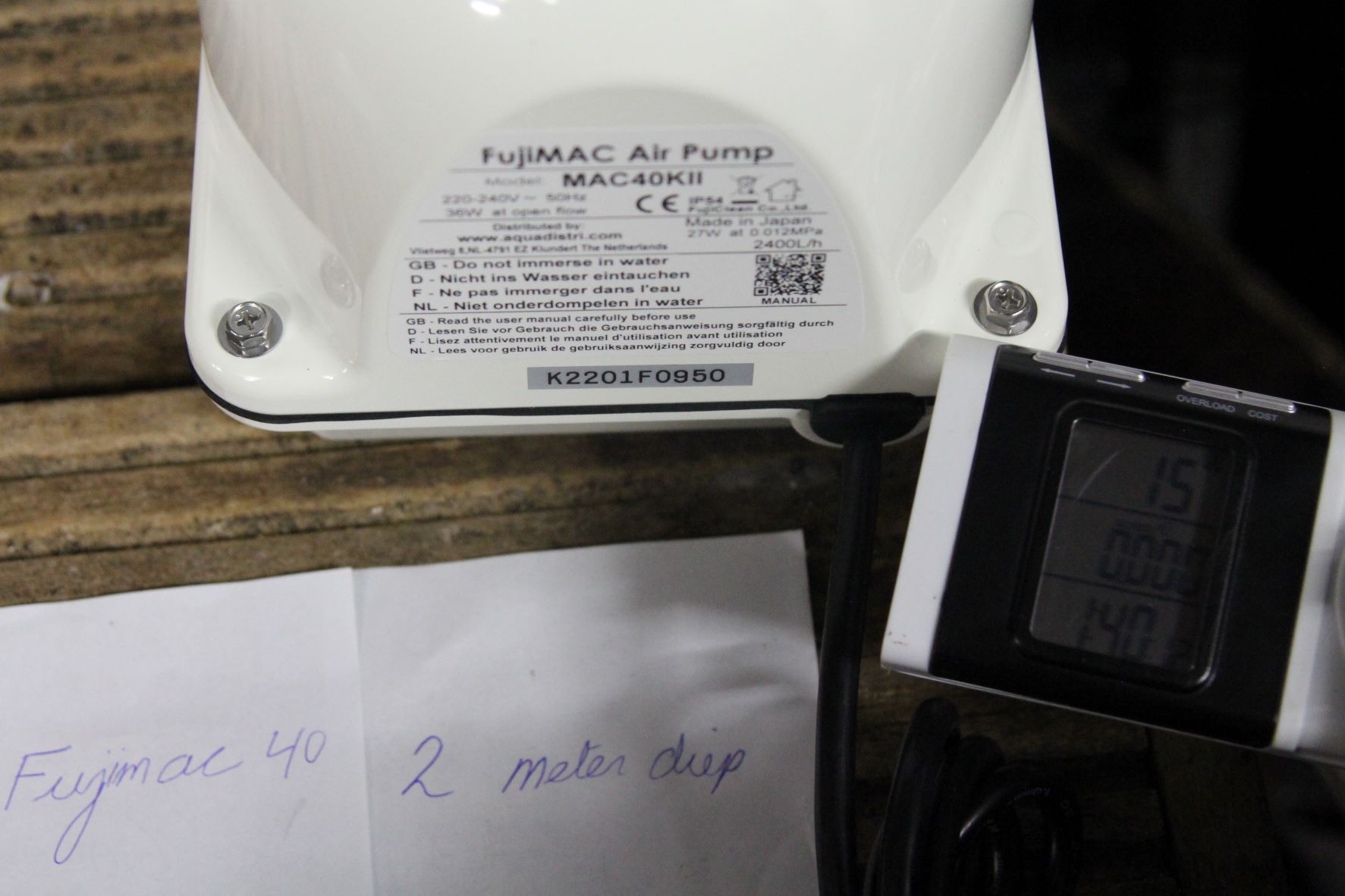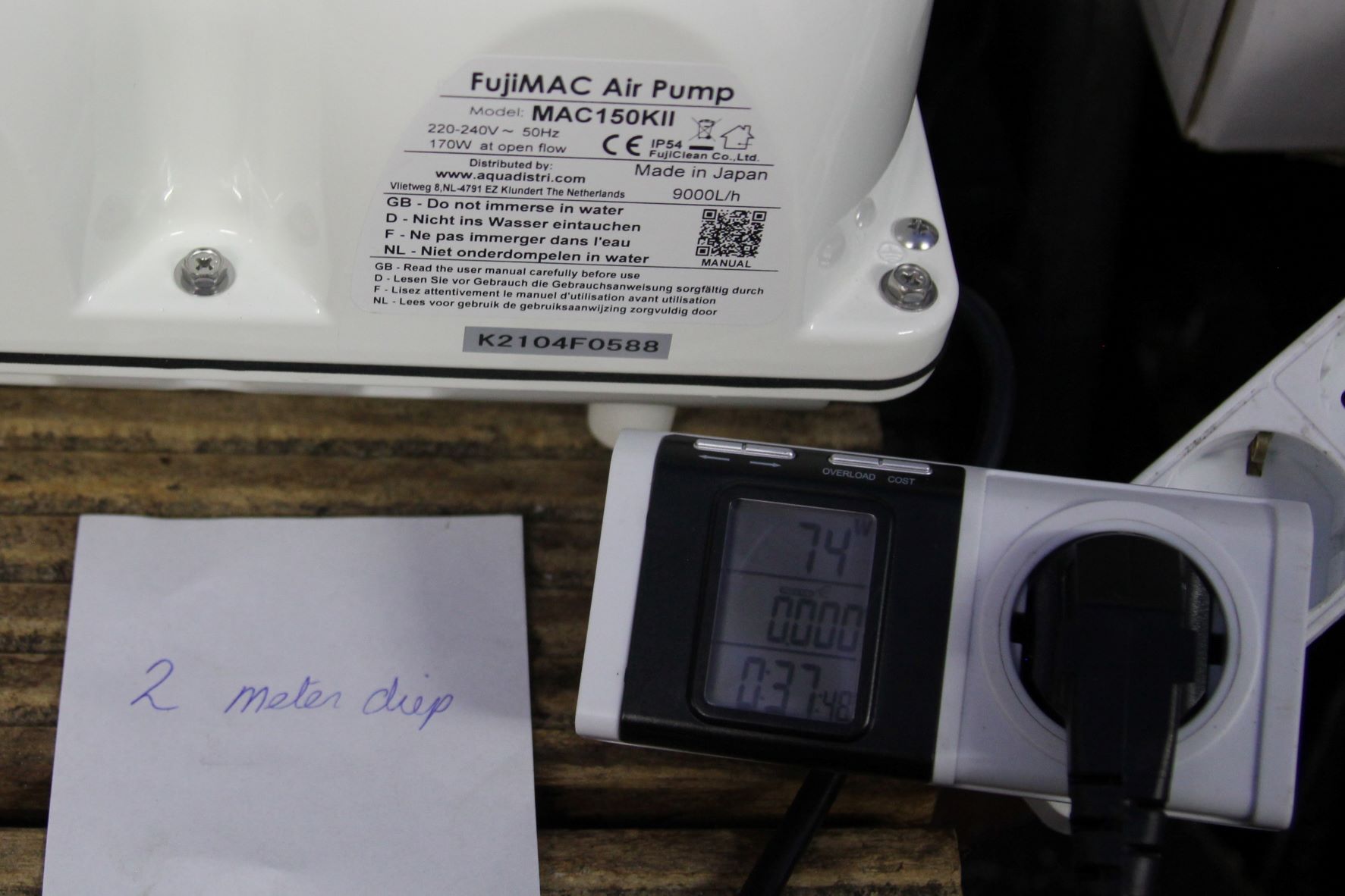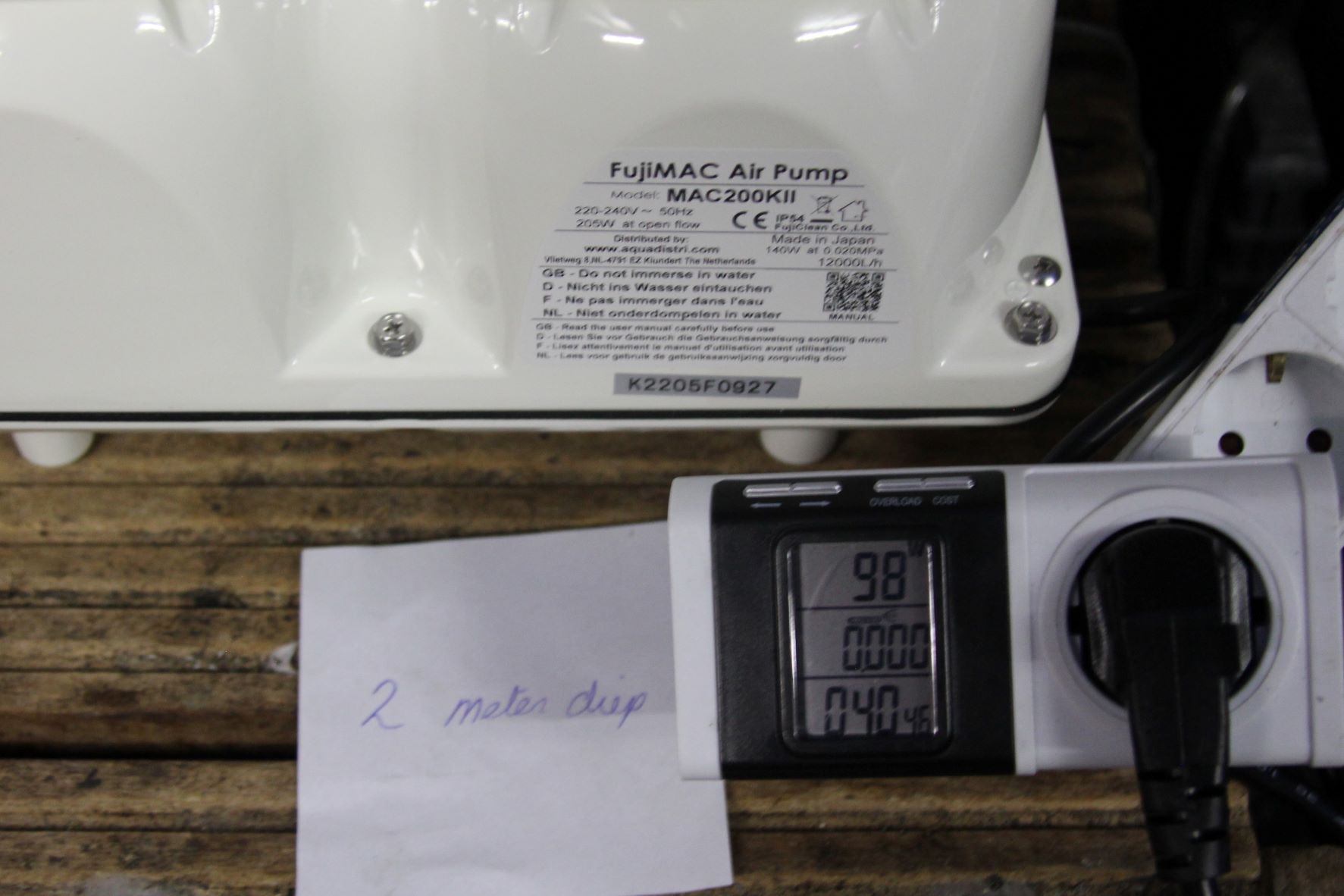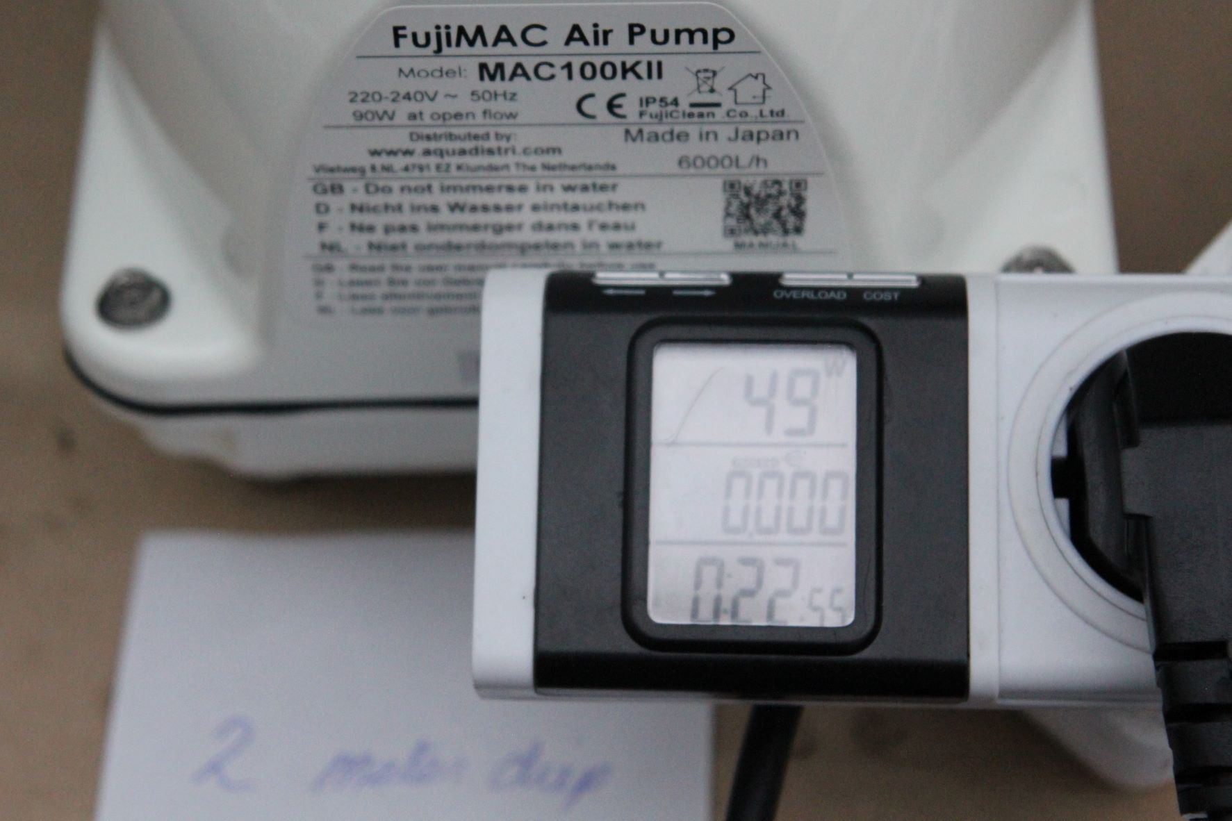 De Fujimac 100 geeft zeer veel lucht opbrengst ongeveer gelijk met Airtecht 150 op 2 meter diepte!!!!! zo bespaar je 35 watt per uur besparing per uur X 24 uur x 365 dagen x 70 cent = Eur 214,62