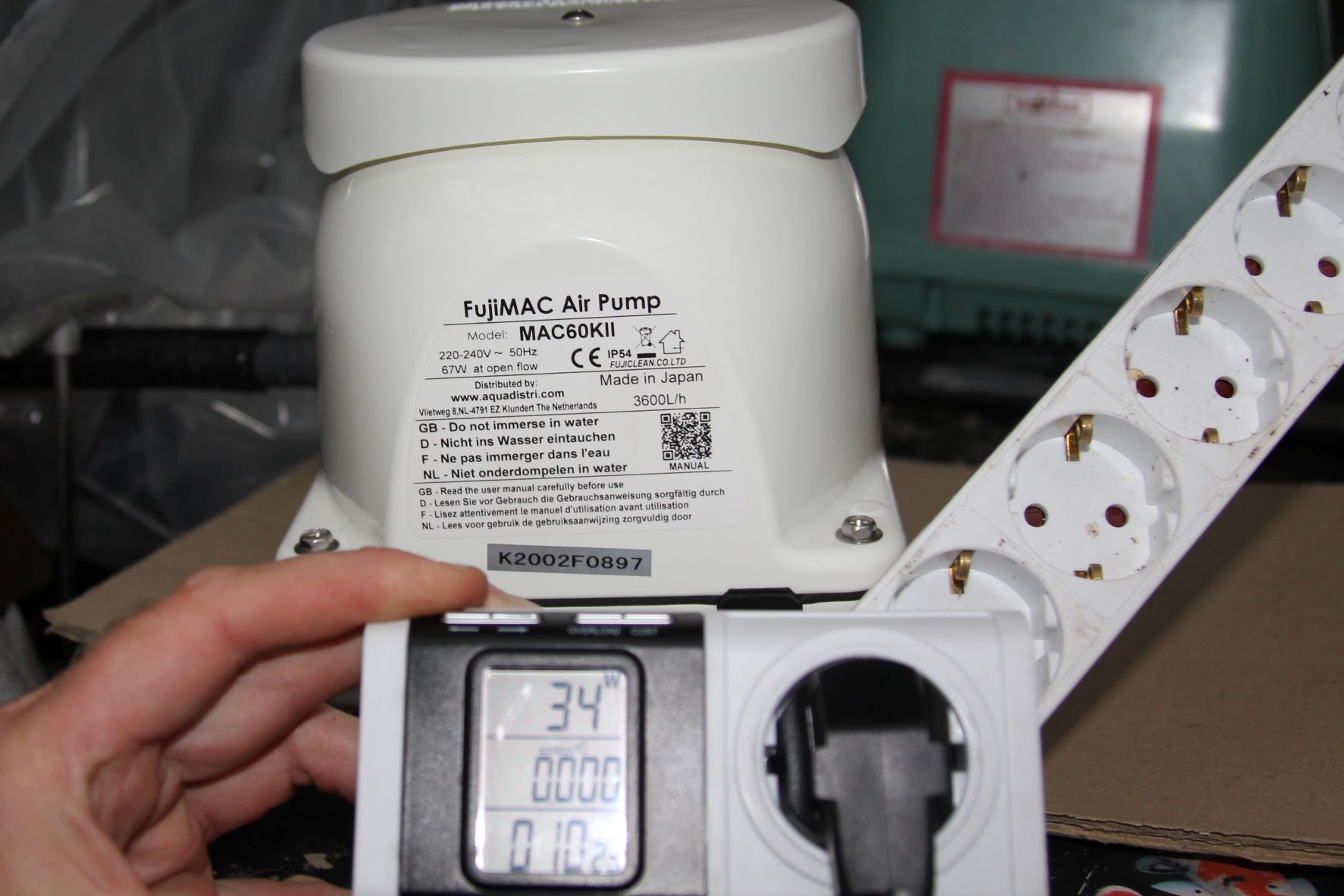 De fujimac 60 Ter vergelijking met een Superfish 60 bespaar je 16 watt per uur en de Fujimac 60 is ook nog eens sterker! Je krijgt er dus meet luchtopbrengst op 2 meter diepte besparing per uur 0,016 X 24 uur x 365 dagen x 70 cent = Eur 98,11 bespaar je met deze pomp per jaar! En je koi hebben veel meer zuurstof. Ter vergelijking met andere A merk pompen zoals de Hi bLow en Alita geeft de Fujimac 60 iets minder rendement op 2 meter diepte. In filteropstelling geeft deze pomp wel heel veel lucht en daarmee zuurstof!!!!